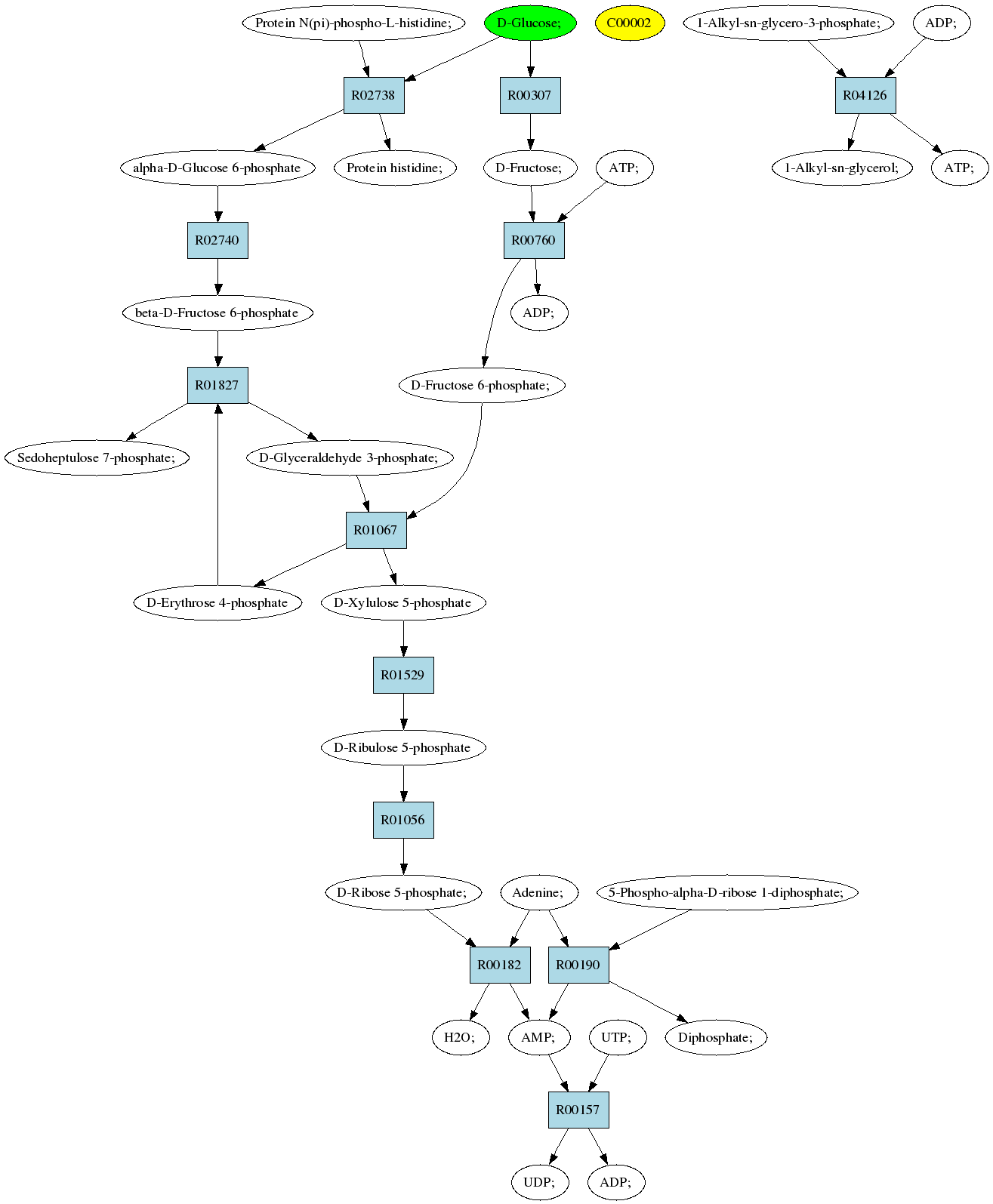 | RP02452 | R02738 | 0 | Protein N(pi)-phospho-L-histidine; + D-Glucose; <=> alpha-D-Glucose 6-phosphate + Protein histidine; |