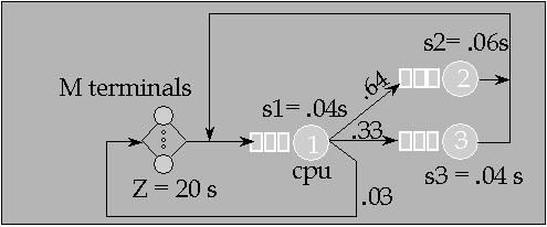 Just in case the fig does not print, s1=0.04 s (not 0.05), s2 = 0.06 s (not 0.08), s3=0.04 s, Prob(1,2) = 0.64 (not 0.55), Prob(1,3) = 0.33 (not 0.40), and Prob(1,terminals) = 0.03 (not 0.05). (Earlier version of this homework had erroneus s1=0.4)