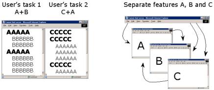 Let us assume that the user needs the data produced by features A and B at the same time in task 1, and in task 2, he needs the data produced by the features A and C at the same time (Figure 2.4). For this, a good user interface design would show a visualization of the data produced by features A and B at the same time for task 1 (on the left), and the data produced by features C and A for task 2 (on the right). If the user interface is not designed to support whole tasks (goals), but instead piece by piece, the user interface will most probably show separate areas (e.g. windows, as in Figure 2.4 on the right) with the data produced by feature A on the first, feature B on the second, and feature C on the third. It may be difficult to move between the windows, and the user may not be able to see the data from features A and B at the same time. Instead, the data should be visualized and organized to support the task at hand (Figure 2.4 on the left).
