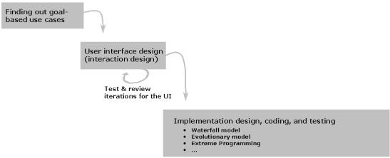If we schedule the user interface design and the analysis of users’ goals as their own phases at the beginning of the project, we can solve the problem of finding out the need for changes at too late a stage in the waterfall model (Figure 4.1). The descriptions of users' goals and the user interface images are the part of the system that the customer and the users will understand, and iteration with the help of screen images is very inexpensive compared to iteration with the help of code. The greatest and most expensive risks shift from the requirements specification and user interface design into the implementation solutions.
