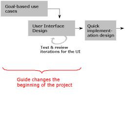In our GUIDe project model (Goals - User Interface Design - Implementation), the user interface is designed in the beginning of the project as a concrete requirement for the system architecture or database design. An explicit user interface design phase ensures that it will be possible to test the user interface and the system's applicability to its intended use at such an early stage that any changes indicated by the test results, even major ones, will still be easy to make. Making the necessary changes to the ‘screenshot’ sequences of the user interface specification requires less work and is much cheaper than using a functioning piece of software as an iteration tool for customer requirements and user interface design. The user interface specification is an illustrative miniature model of the system, which makes it also an effective communications tool between the developer and the customer.