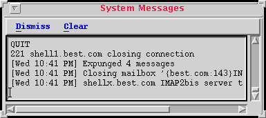 If you have a mailbox open, you are presented with a list of messages. To select a message, use the mouse "select" button (normally the left button). If you double-click the select button quickly, the message will be read in a separate Read Window. Many message operations may be performed from this window, and you may select multiple messages for these operations. To select a range of messages, hold down the [shift] key while depressing the mouse "select" button, and drag the mouse through the messages of interest. Alternately, if you wish to exclude certain messages within the range, hold down the [ctrl] key while dragging or selecting messages. The difference in this mode of operation is that you may toggle any individual message to be unselected or selected within a given range.