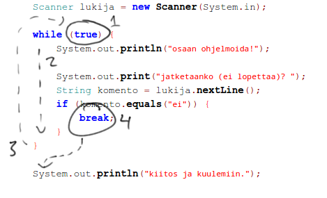 Huom! Komento Ohjain.sammuta() sammuttaa vain robottiohjaimen, ei ohjelmaasi jonka kautta robottiohjainta käytetään. Avainsanasta break saattaa olla tässä hyötyä..