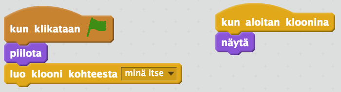 Scratchissä hahmot ja sen kloonit ovat kaksi eri asiaa. Jos niiden haluttaisiin toimivan samoin täytyisi samat toiminnallisuudet ohjelmoida erikseen kummallekin. Ohjelmoidaan nyt kuitenkin kaikki vain klooneille ja piilotetaan alkuperäinen hahmo.