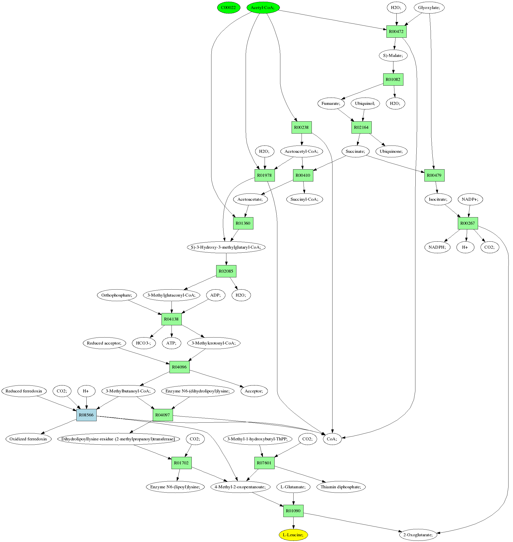 | RP01666 | R08566 | 41 | TRIRE0081576 | O58413|VORA_PYRHO | 0.011 | 1.2.7.7 | CoA; + 4-Methyl-2-oxopentanoate; + Oxidized ferredoxin <=> 3-Methylbutanoyl-CoA; + CO2; + H+ + Reduced ferredoxin |