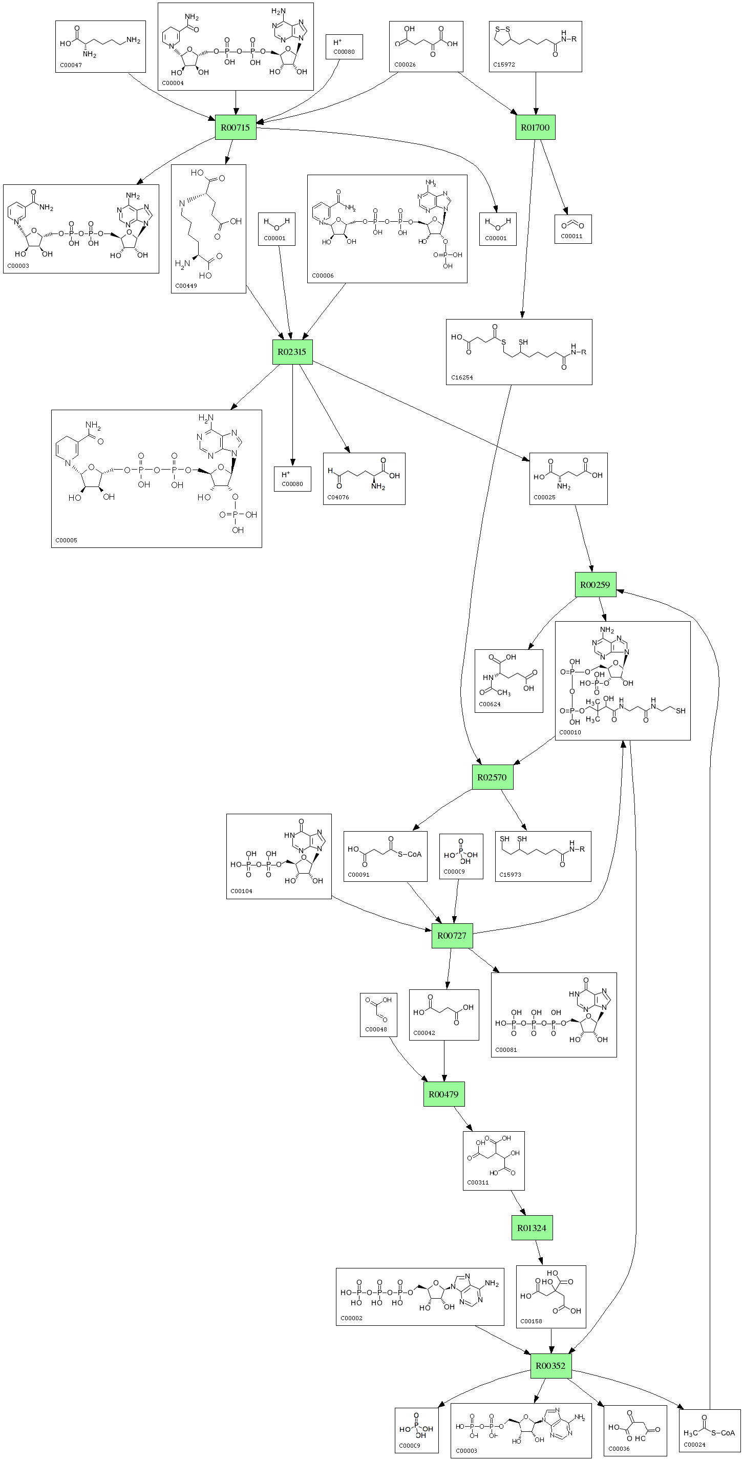 | RP00602 | R02315 | 707 | TRIRE0123631 | Q9P4R4|LYS9_MAGGR | 0.0 | 1.5.1.10 | NADP+; + H2O; + N6-(L-1,3-Dicarboxypropyl)-L-lysine; <=> L-Glutamate; + L-2-Aminoadipate 6-semialdehyde; + NADPH; + H |