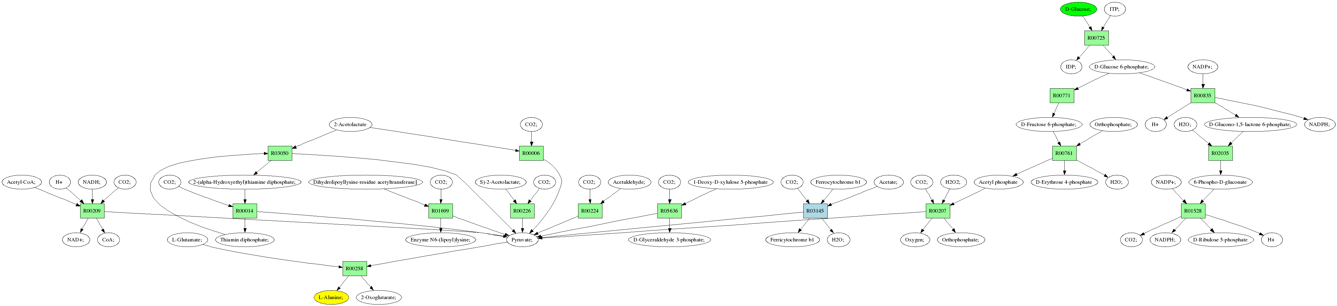 | RP00021 | R00258 | 477 | TRIRE0109187 | P52893|ALAM_YEAST | e-134 | 2.6.1.2 | L-Alanine; + 2-Oxoglutarate; <=> L-Glutamate; + Pyruvate; |