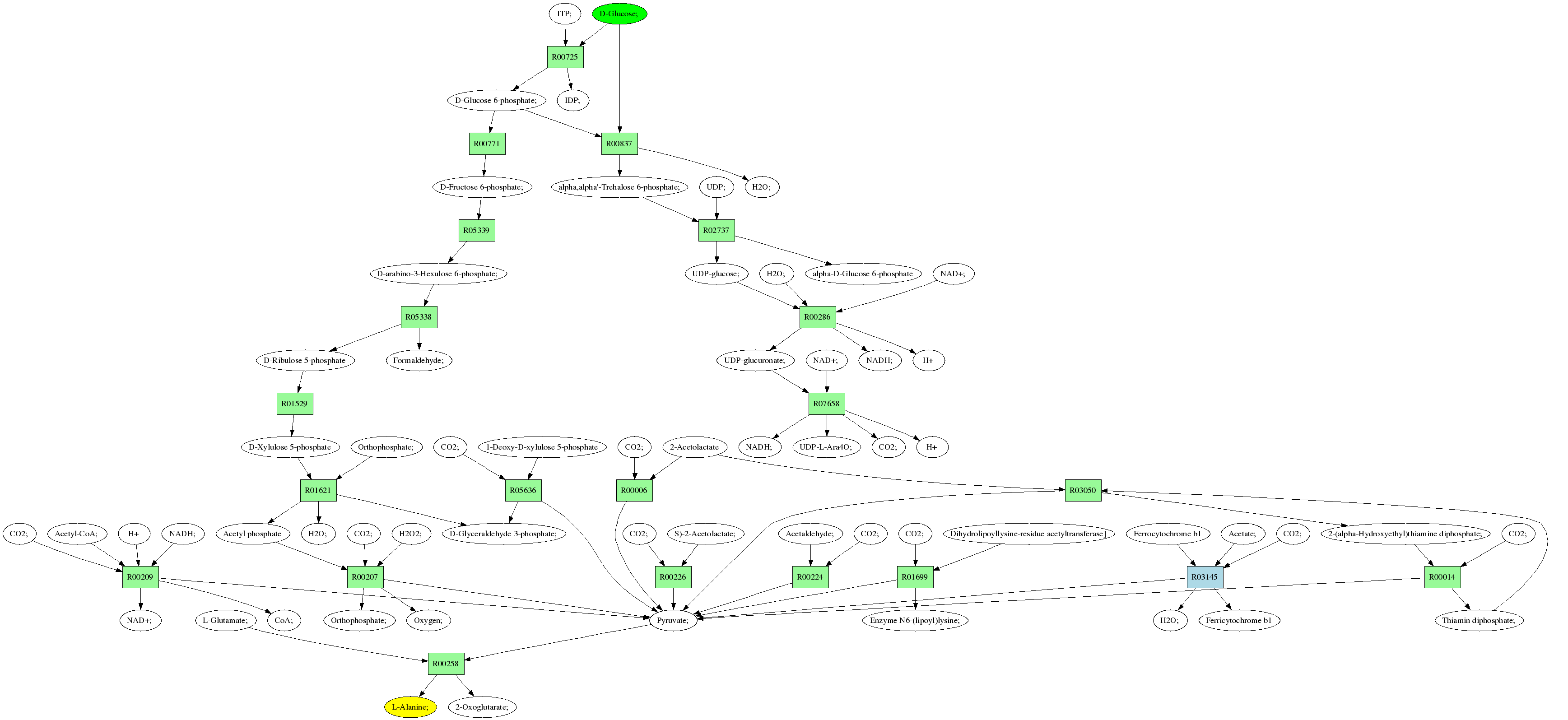 | RP00021 | R00258 | 477 | TRIRE0109187 | P52893|ALAM_YEAST | e-134 | 2.6.1.2 | L-Alanine; + 2-Oxoglutarate; <=> L-Glutamate; + Pyruvate; |