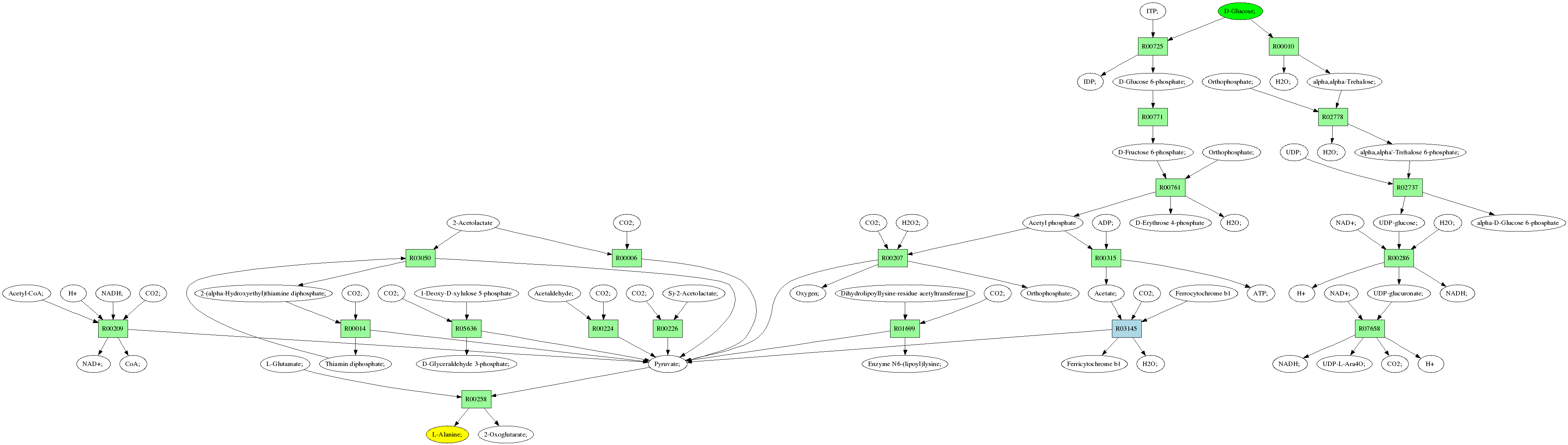 | RP00021 | R00258 | 477 | TRIRE0109187 | P52893|ALAM_YEAST | e-134 | 2.6.1.2 | L-Alanine; + 2-Oxoglutarate; <=> L-Glutamate; + Pyruvate; |