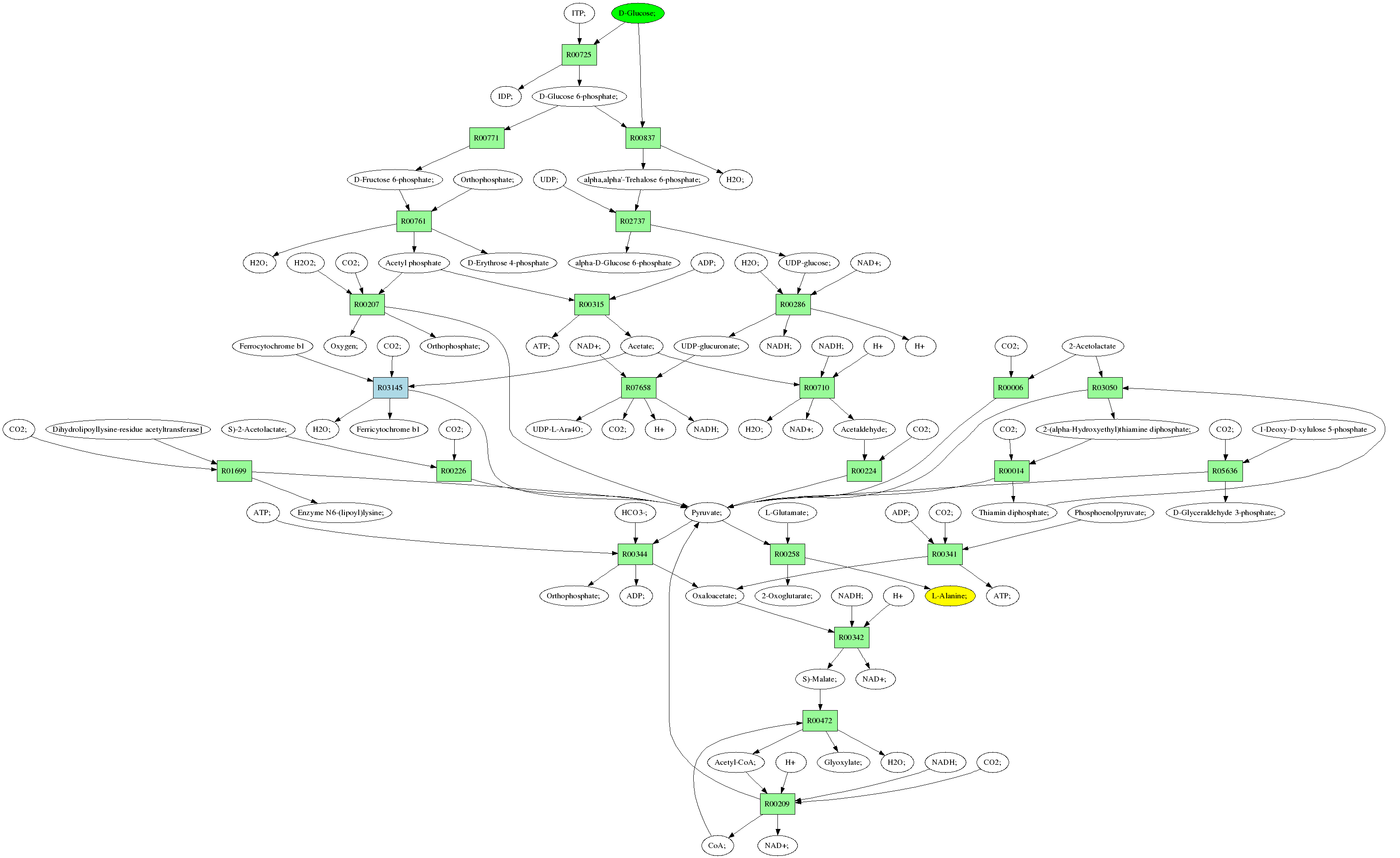 | RP00021 | R00258 | 477 | TRIRE0109187 | P52893|ALAM_YEAST | e-134 | 2.6.1.2 | L-Alanine; + 2-Oxoglutarate; <=> L-Glutamate; + Pyruvate; |