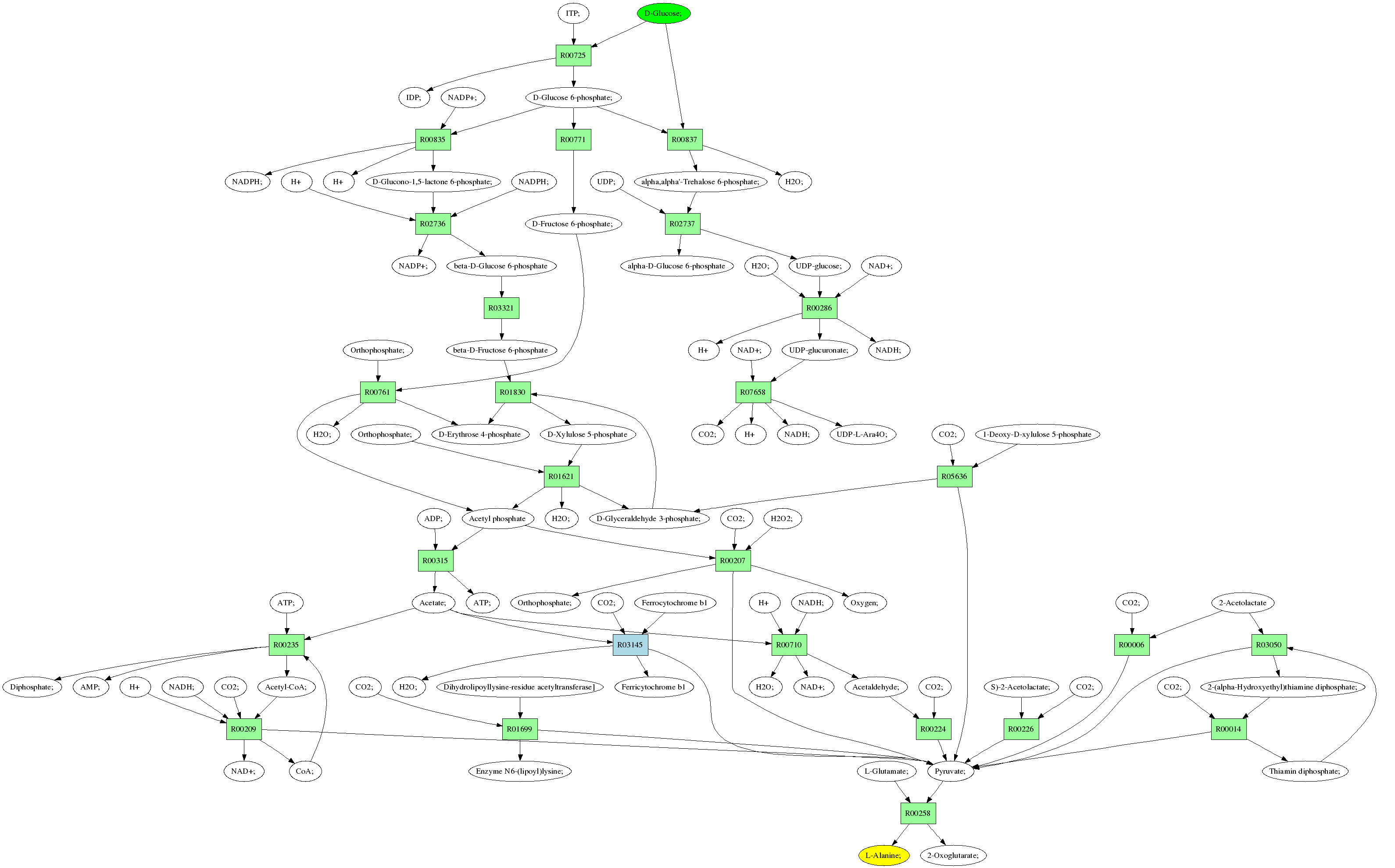 | RP00021 | R00258 | 477 | TRIRE0109187 | P52893|ALAM_YEAST | e-134 | 2.6.1.2 | L-Alanine; + 2-Oxoglutarate; <=> L-Glutamate; + Pyruvate; |