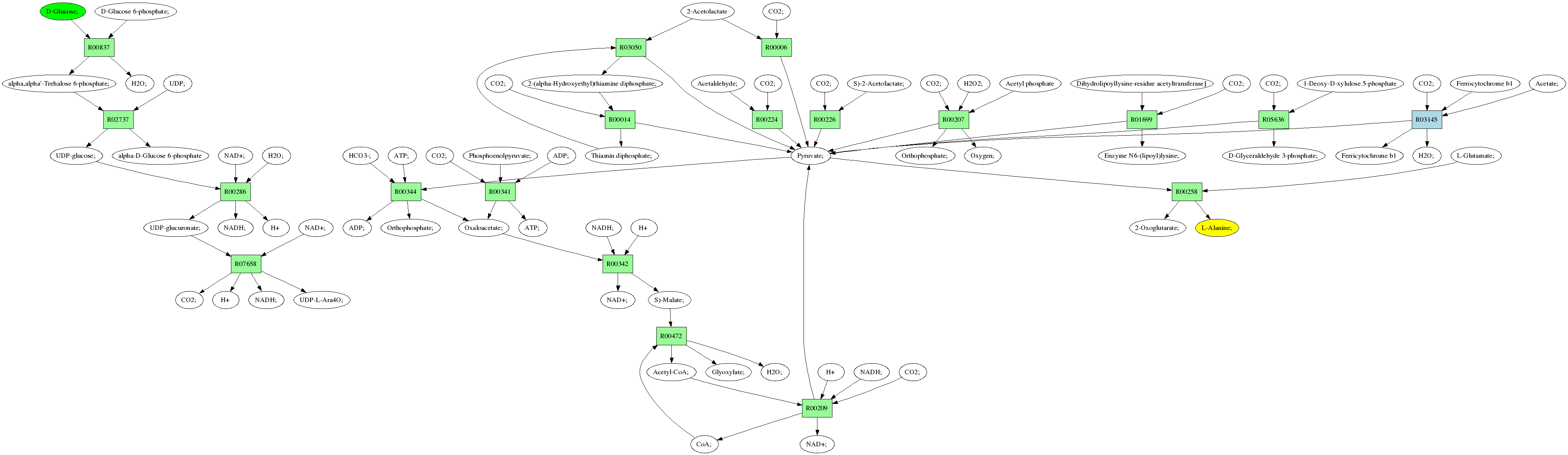 | RP00021 | R00258 | 477 | TRIRE0109187 | P52893|ALAM_YEAST | e-134 | 2.6.1.2 | L-Alanine; + 2-Oxoglutarate; <=> L-Glutamate; + Pyruvate; |
