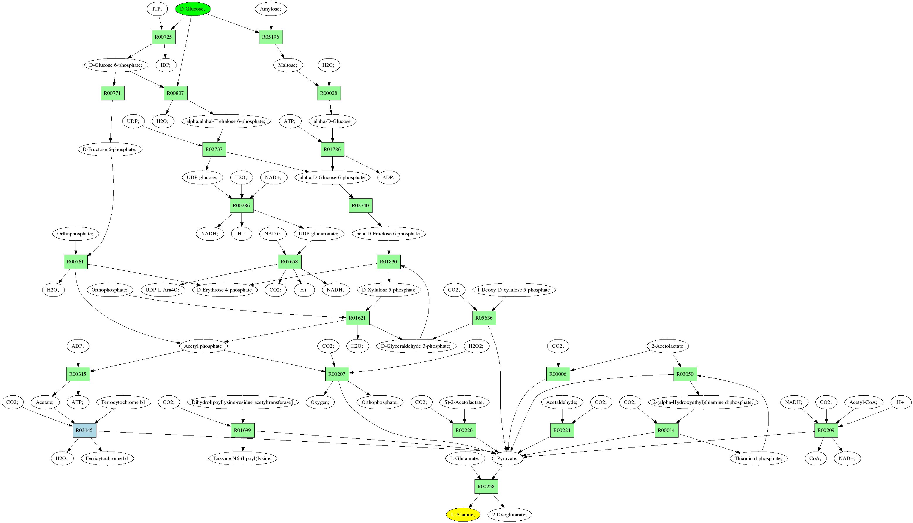 | RP00021 | R00258 | 477 | TRIRE0109187 | P52893|ALAM_YEAST | e-134 | 2.6.1.2 | L-Alanine; + 2-Oxoglutarate; <=> L-Glutamate; + Pyruvate; |