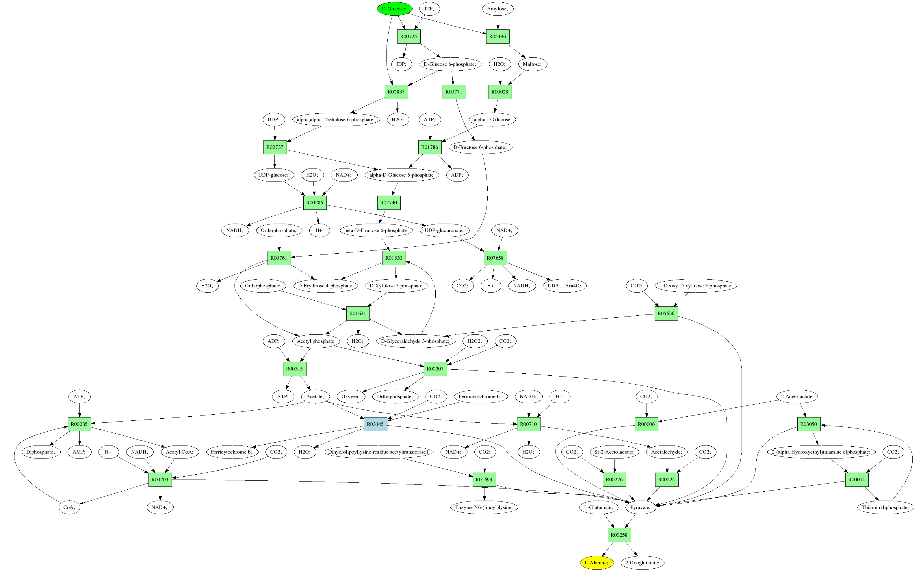 | RP00021 | R00258 | 477 | TRIRE0109187 | P52893|ALAM_YEAST | e-134 | 2.6.1.2 | L-Alanine; + 2-Oxoglutarate; <=> L-Glutamate; + Pyruvate; |