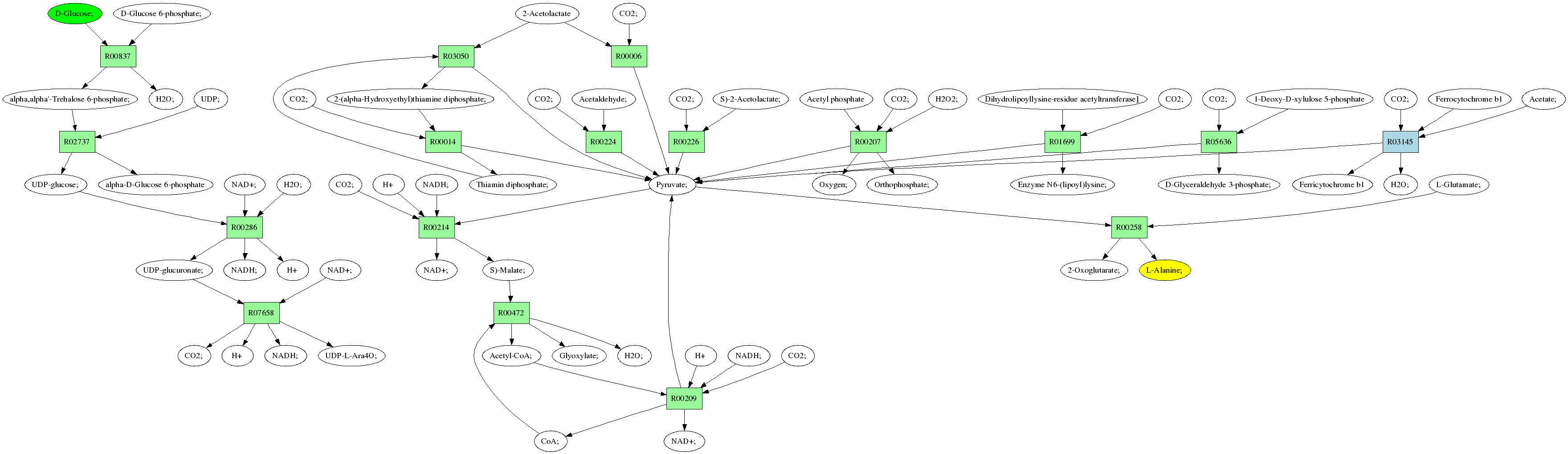 | RP00021 | R00258 | 477 | TRIRE0109187 | P52893|ALAM_YEAST | e-134 | 2.6.1.2 | L-Alanine; + 2-Oxoglutarate; <=> L-Glutamate; + Pyruvate; |