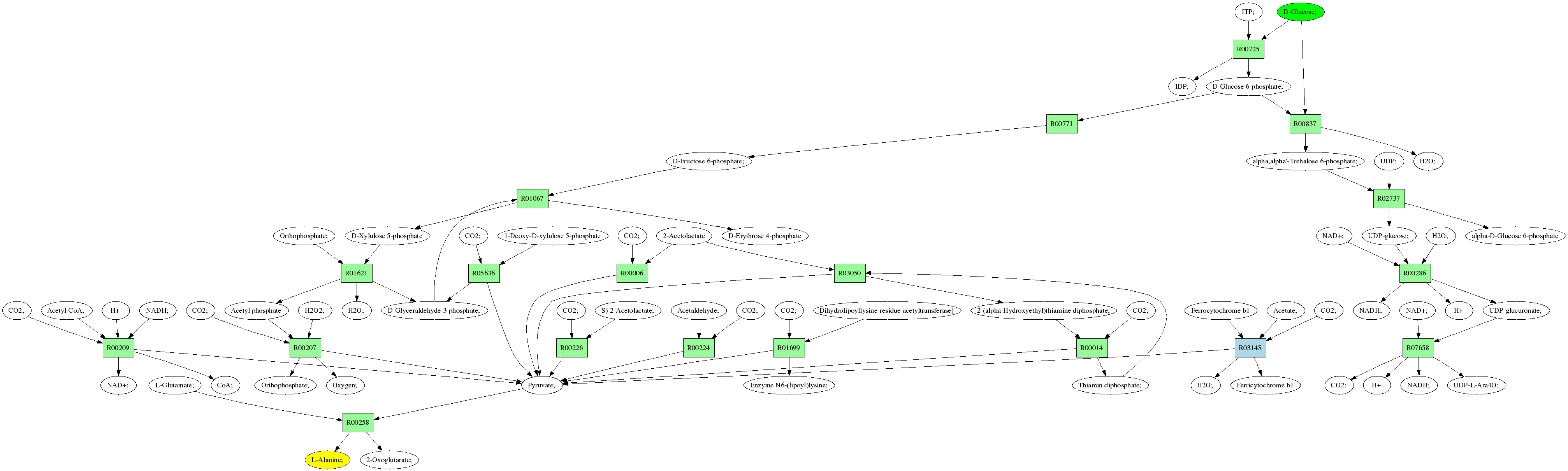 | RP00021 | R00258 | 477 | TRIRE0109187 | P52893|ALAM_YEAST | e-134 | 2.6.1.2 | L-Alanine; + 2-Oxoglutarate; <=> L-Glutamate; + Pyruvate; |