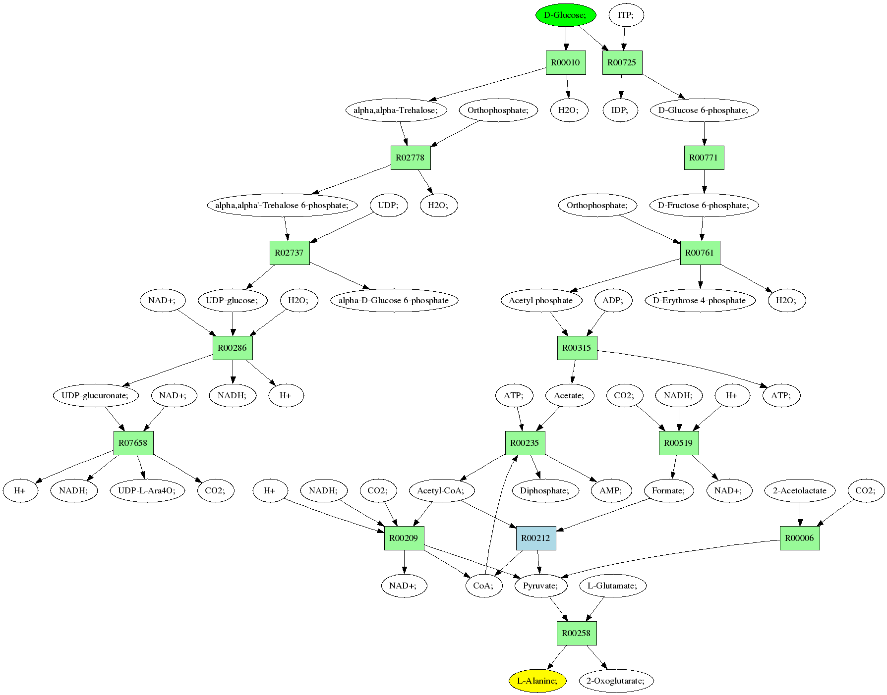 | RP00021 | R00258 | 477 | TRIRE0109187 | P52893|ALAM_YEAST | e-134 | 2.6.1.2 | L-Alanine; + 2-Oxoglutarate; <=> L-Glutamate; + Pyruvate; |