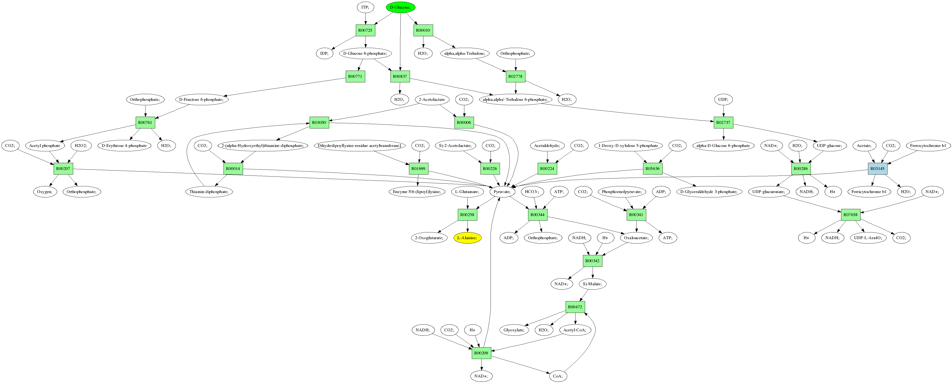 | RP00021 | R00258 | 477 | TRIRE0109187 | P52893|ALAM_YEAST | e-134 | 2.6.1.2 | L-Alanine; + 2-Oxoglutarate; <=> L-Glutamate; + Pyruvate; |