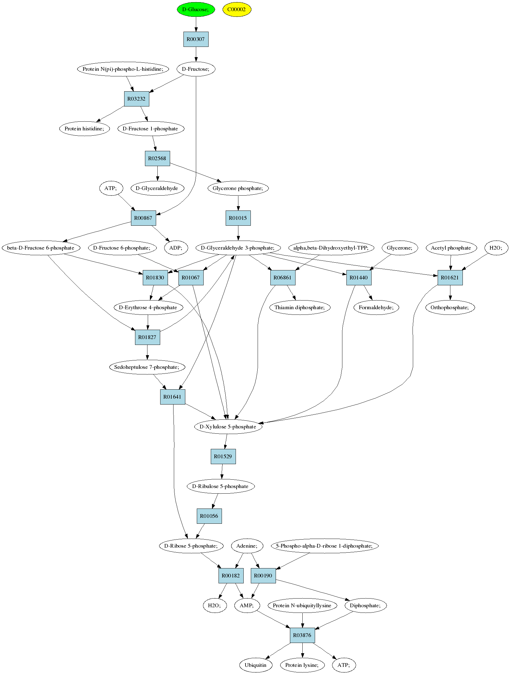 | RP06727 | R01830 | 0 | D-Glyceraldehyde 3-phosphate; + beta-D-Fructose 6-phosphate <=> D-Xylulose 5-phosphate + D-Erythrose 4-phosphate |