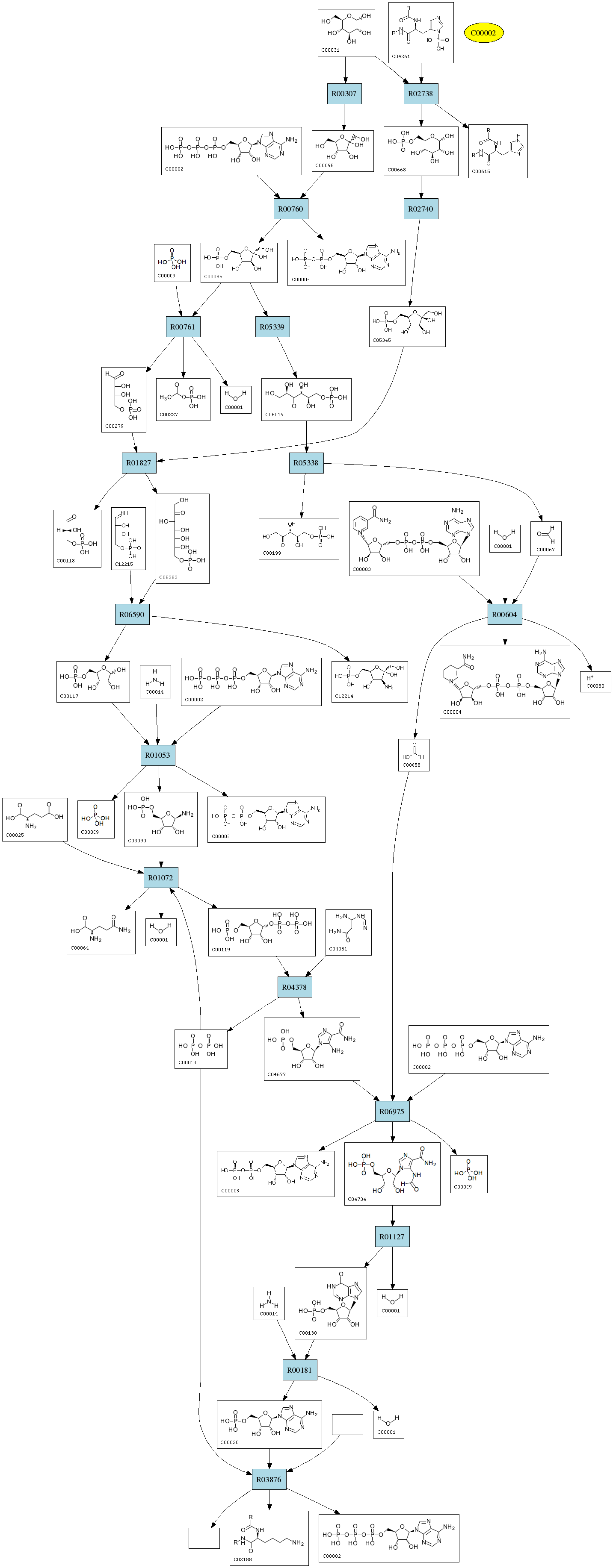 | RP04020 | R04378 | 0 | Diphosphate; + 1-(5'-Phosphoribosyl)-5-amino-4-imidazolecarboxamide; <=> 5-Amino-4-imidazolecarboxyamide + 5-Phospho-alpha-D-ribose 1-diphosphate; |