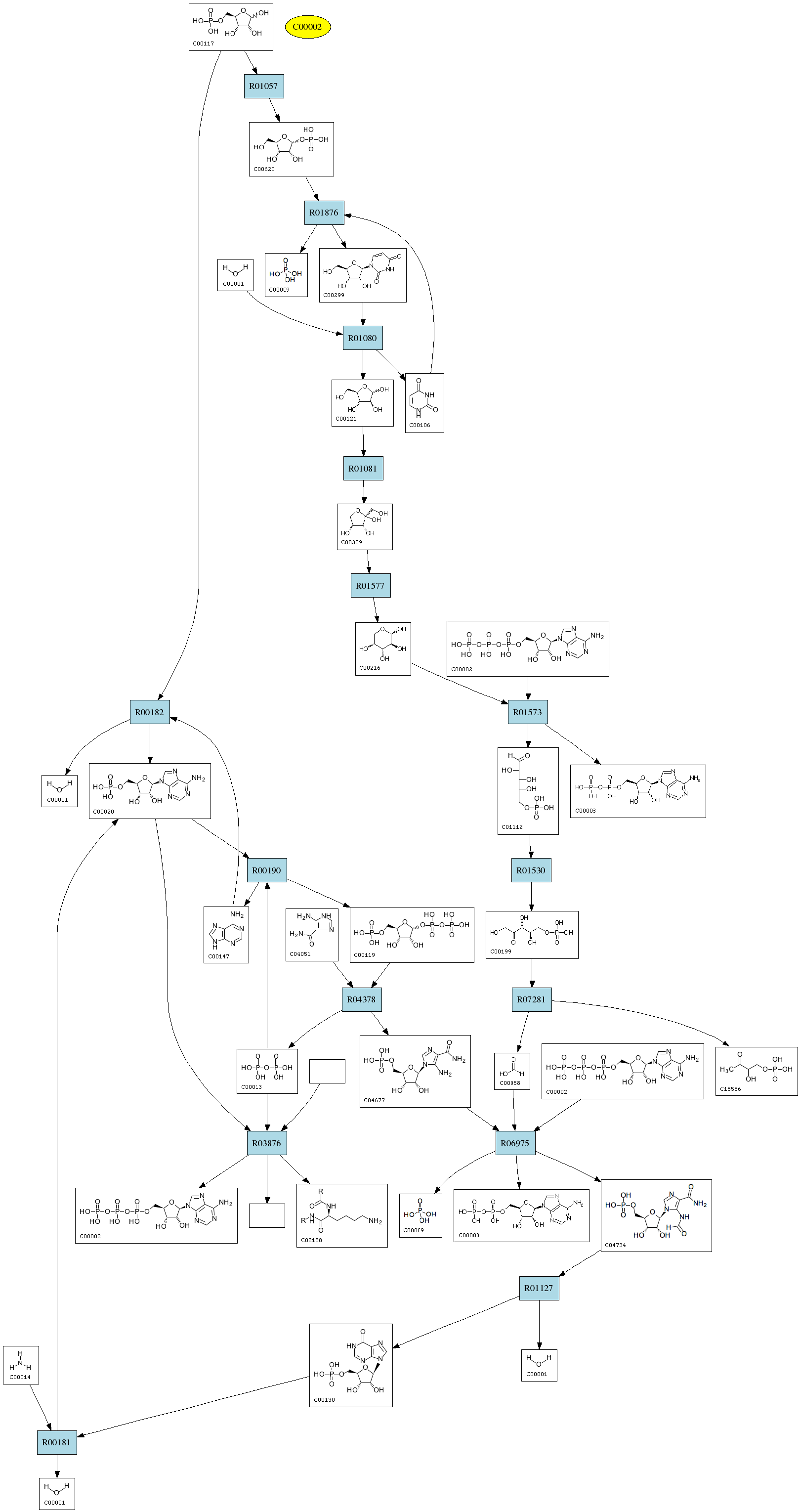 | RP04020 | R04378 | 0 | Diphosphate; + 1-(5'-Phosphoribosyl)-5-amino-4-imidazolecarboxamide; <=> 5-Amino-4-imidazolecarboxyamide + 5-Phospho-alpha-D-ribose 1-diphosphate; |