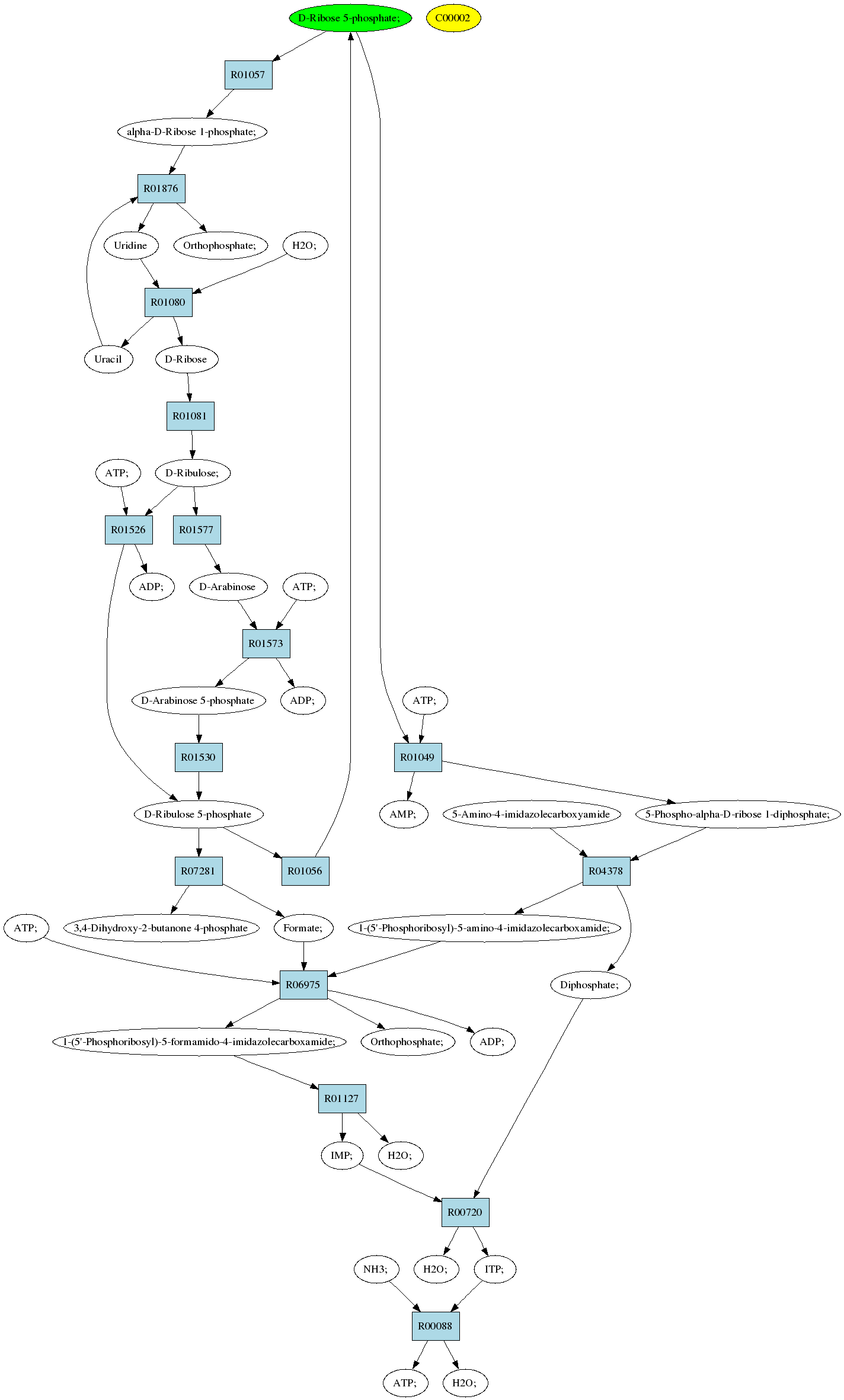 | RP01319 | R01127 | 0 | H2O; + IMP; <=> 1-(5'-Phosphoribosyl)-5-formamido-4-imidazolecarboxamide; |