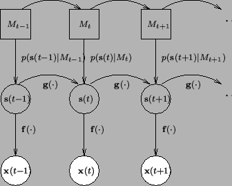 As we saw in Section 4.3, there are several possible ways to combine the HMM and the NSSM. The approach with switching dynamics seems more reasonable, so we shall concentrate on it. Hence the illustration of the NSSM in Figure 5.1 is augmented with the discrete HMM states to get Figure 5.2.