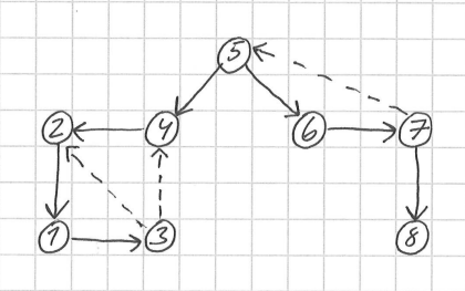 Puukaari a → b vastaa siltaa, jos solmun b alipuusta ei pääse takautuvaa kaarta pitkin solmuun a tai johonkin solmun a esivanhempaan. Esimerkissämme kaari 5 → 4 vastaa siltaa, koska solmun 4 alipuusta ei pääse takautuvaa kaarta pitkin solmuun 5 tai sen esivanhempaan.