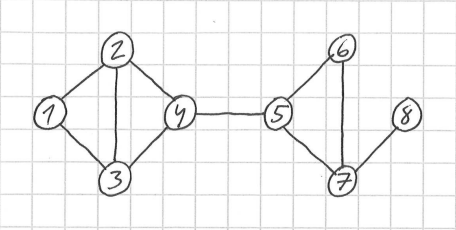 Tässä verkossa kaaret (4,5) ja (7,8) ovat siltoja ja solmut 4, 5 ja 7 ovat artikulaatiopisteitä.