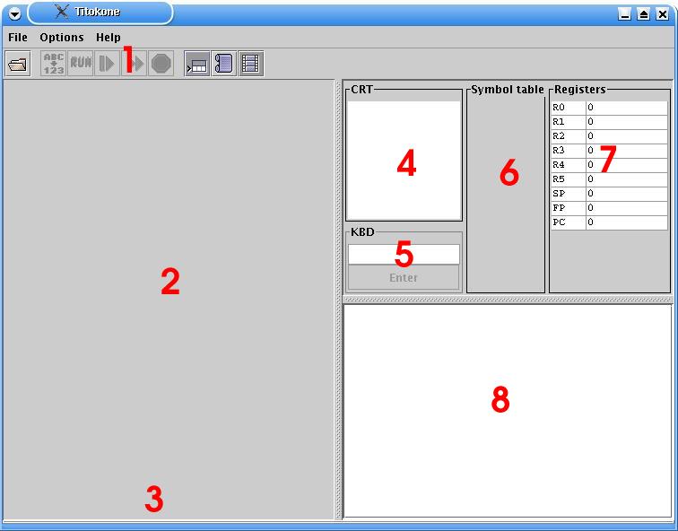 The titokone memory can be emptied by selecting File --> Erase memory from the menu. Besides erasing the memory, it can in practice be used to empty the source code view. If the memory is emptied during compilation or running, the action will be aborted and the opening view, with registers, symbol table and code view have been emptied. Memory can be erased using the shortcut key CTRL-E. Unless the memory is erased or its size is changed, the remnants of old programs can be seen in the memory. The symbolic representations of those lines are hidden for clarity. If a program does not store something in a register or a memory slot before reading from there, the result may well be something different from 0. |