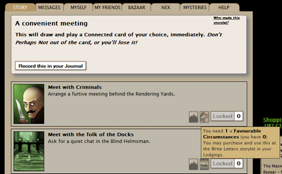 NOTE: When a bunch of "bulk" items are required to open up new parts in the city, buying them all from the Bazaar will typically cost more than it's worth. A better way to gain the items is to find out a Storylet which pays off in the item you need for unlocking, and then repeating that Storylet multiple times. The main reason for this is that you buy from the Bazaar at full price; but sell in only at half price (or even less). Therefore, selling lots of item A to buy lots of item B is less profitable than completing Storylets which pay off in B directly. When I mention "available from the Bazaar", I typically mean that if you are missing just a couple of items from the required amount, you might purchase them from the Bazaar rather than look for a Storylet which pays off in the desired item.