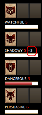 The total cumulative effect the equips have on the Main Qualities is displayed on the left hand side, next to the Main Qualities, as a white +/- modifier: